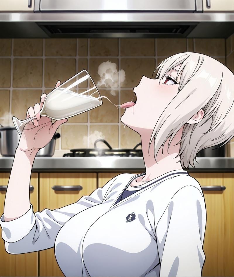 thick semen, heavy breathing, half-closed eyes, nipples,
