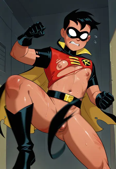 Robin costume, domino mask, red vest, black short sleeves, R Chest symbol, cape, Black gloves, belt, black briefs, black boots,