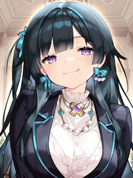 Aiko_CoPa, 1girl, long hair, streaked hair, purple eyes, hair bow, one side up, bow earrings