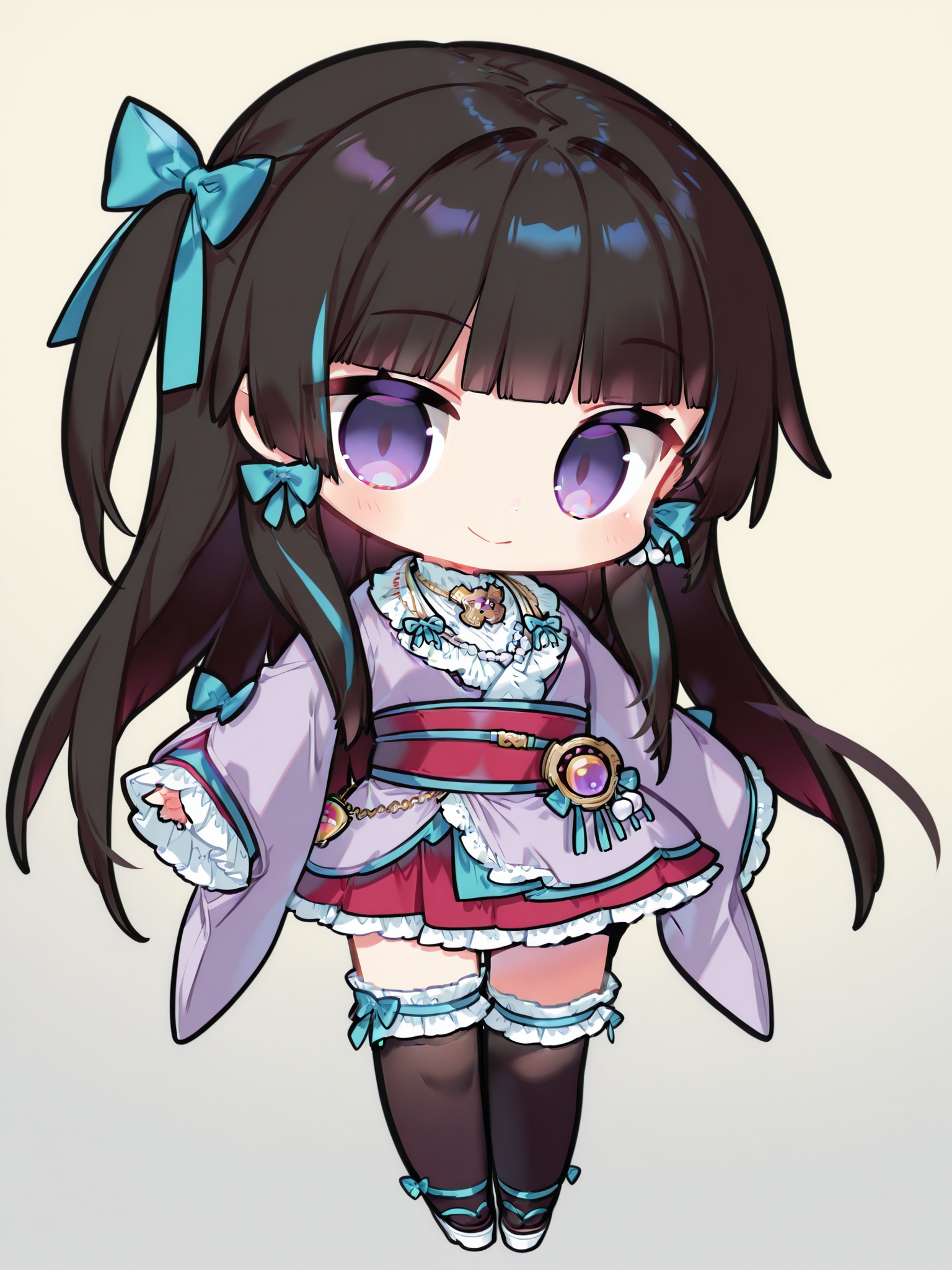 short purple frilled kimono, red skirt, black frilled thighhighs, platform footwear, blue ribbon, gold necklace, red sash, pearl necklace