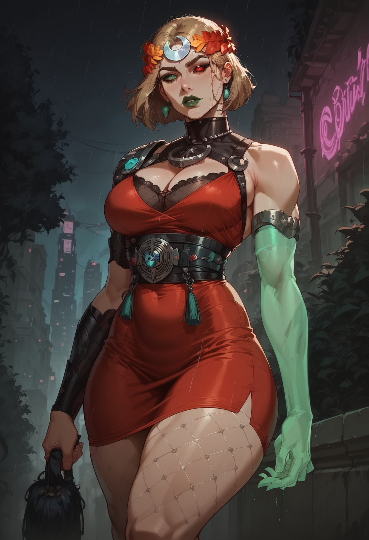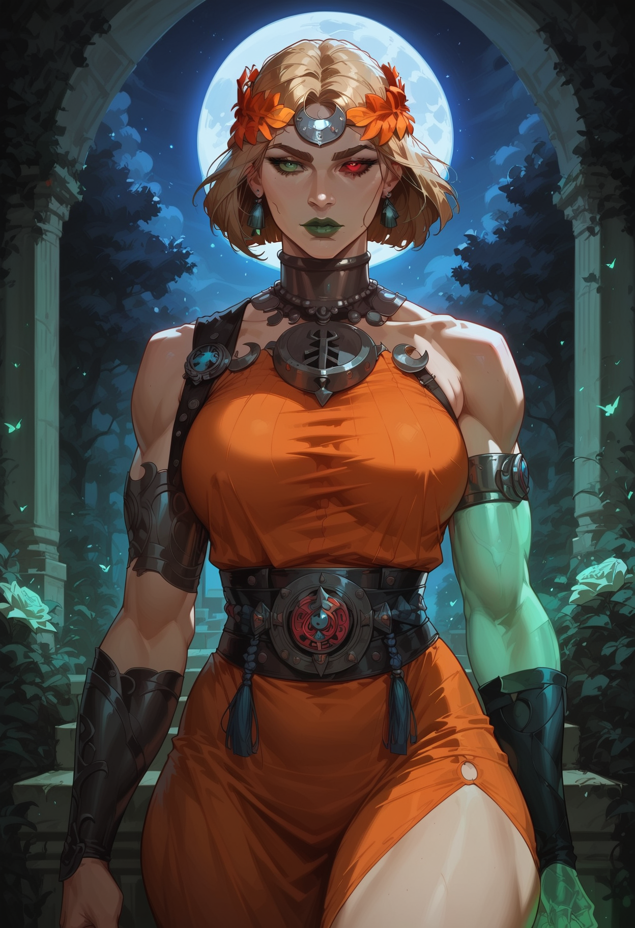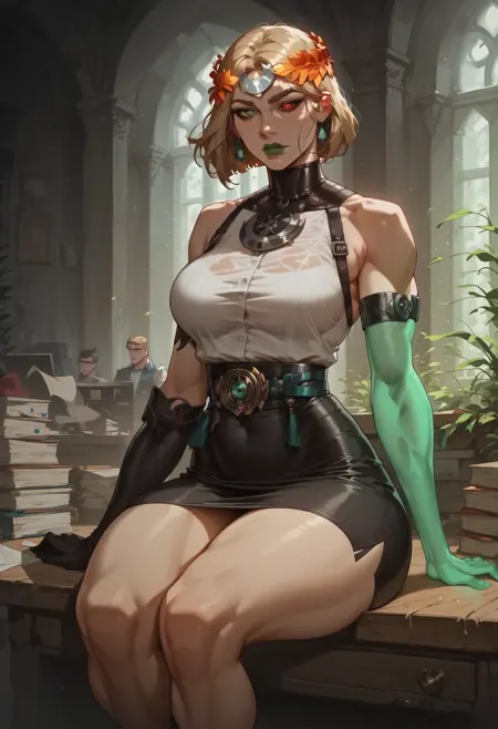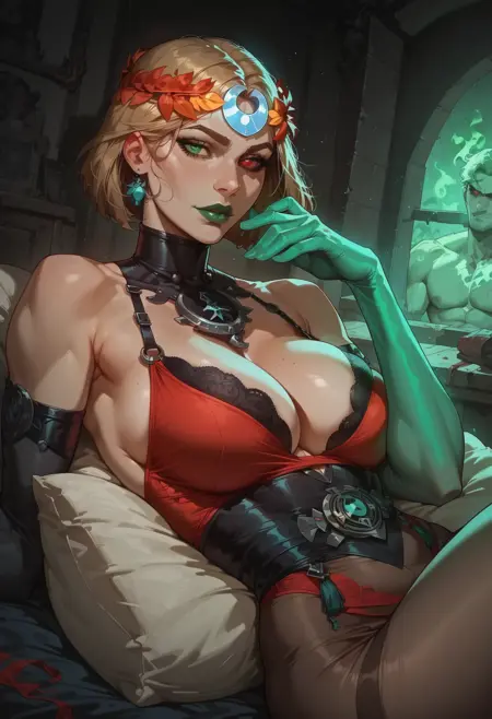 外观关键词: 绿色幽灵手臂、幽灵手、绿色嘴唇、异色瞳、绿色眼睛、红色眼睛配黑色巩膜