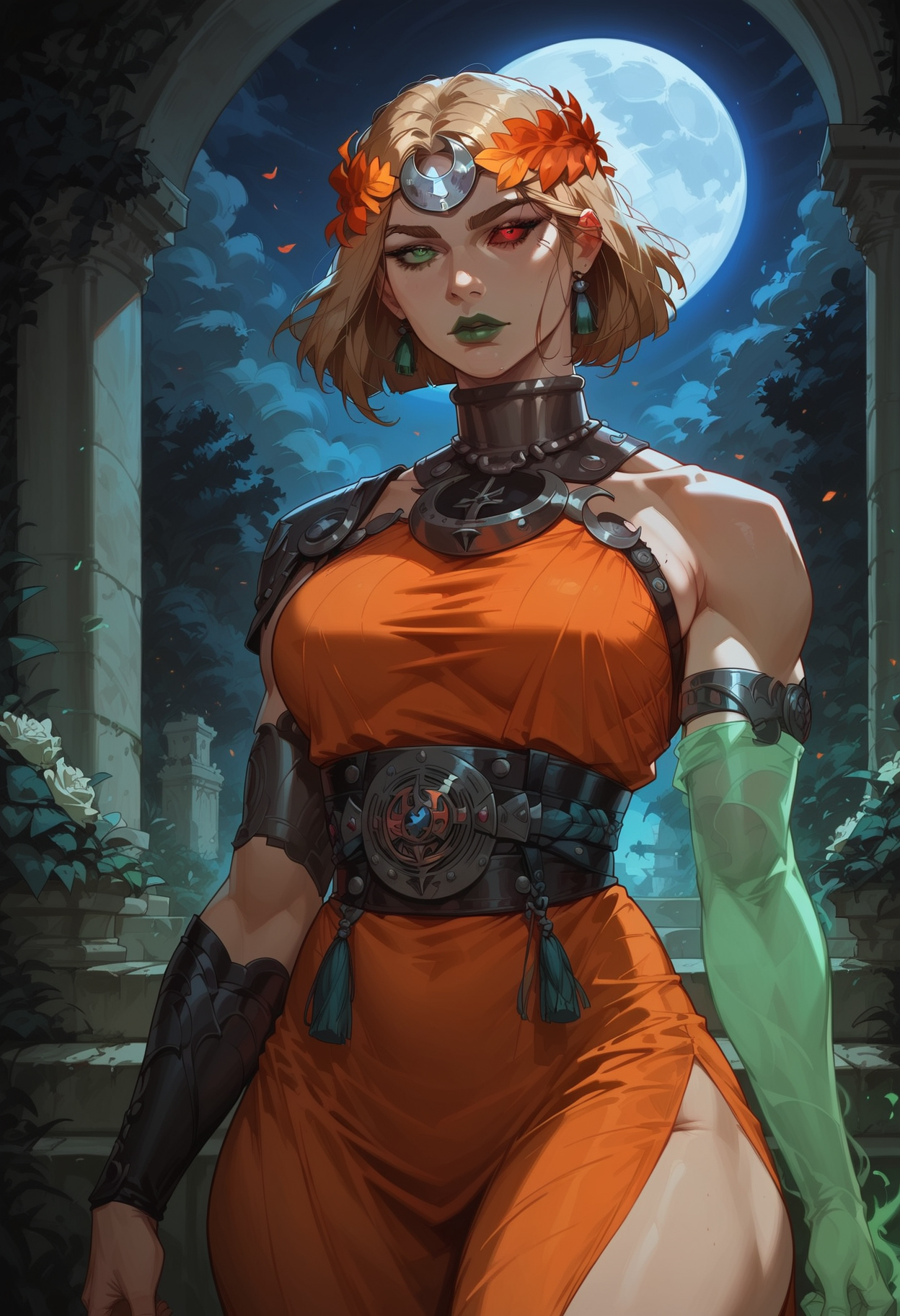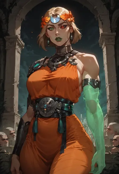 服装关键词: 肘部手套、月桂冠、橙色连衣裙、腰带