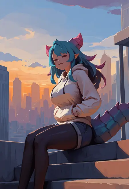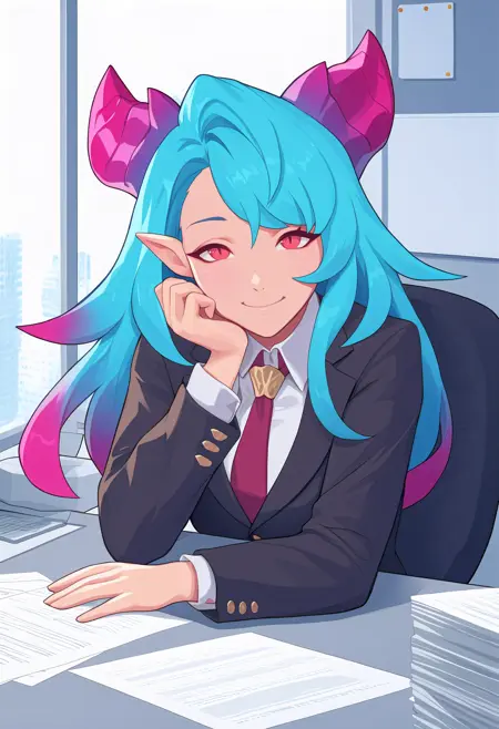 外見: dragon tail, long hair, gradient hair, blue hair, pink hair, dragon horns, pointy ears, red eyes, large breasts
