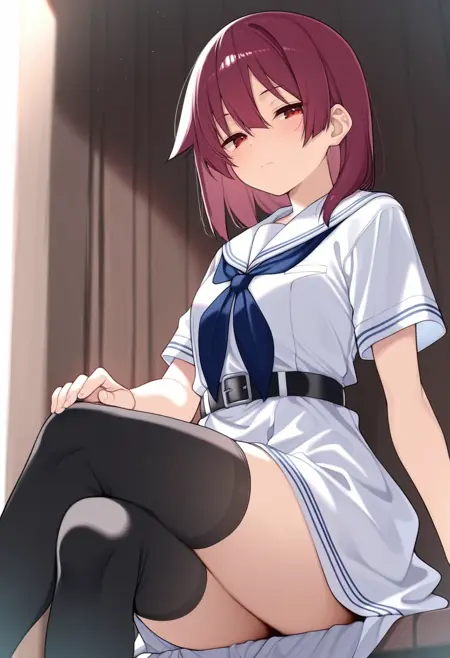 white sailor collar,white dress,blue neckerchief,black belt,short sleeves,