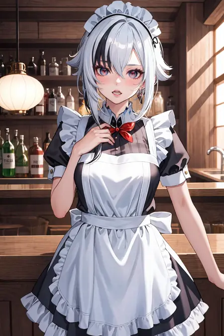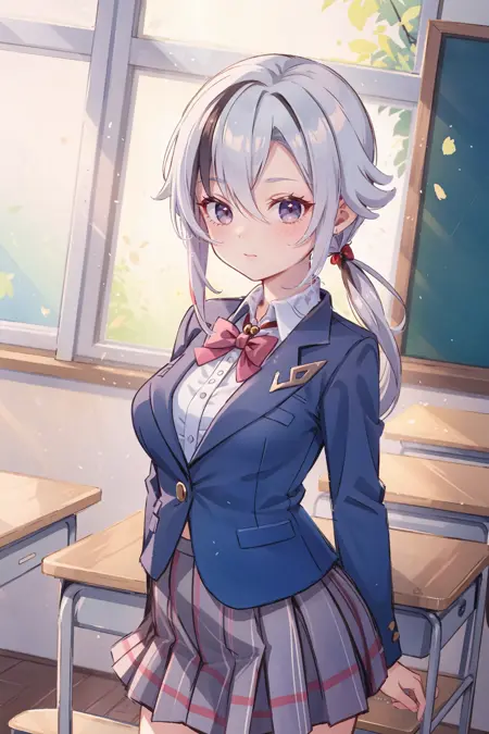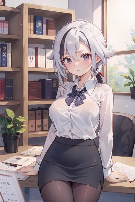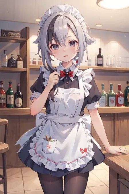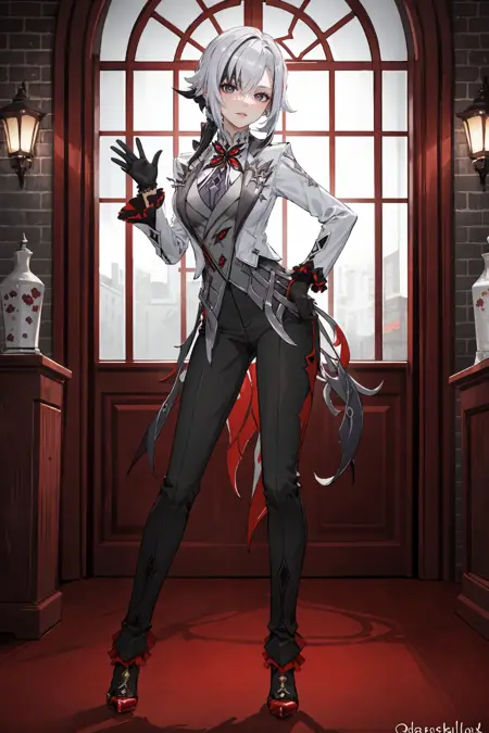 她的默认服装可额外添加或删除的提示词:黑色手套、灰色燕尾服、黑色长裤、灰色背心、灰色衬衫、高跟鞋