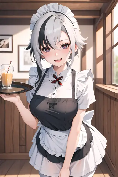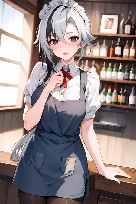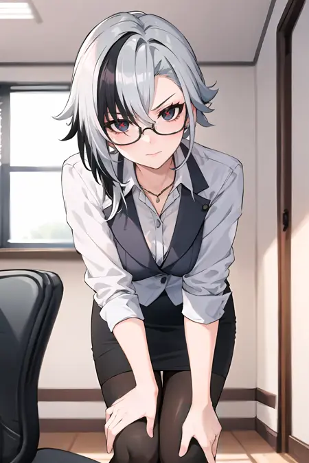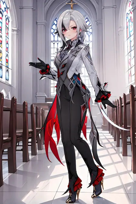 그녀의 기본 복장에 추가할 프롬프트(필요에 따라 추가/제거): 검은 장갑, 회색 테일코트, 검은 바지, 회색 베스트, 회색 셔츠, 하이힐