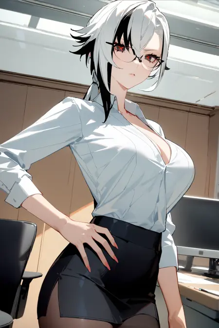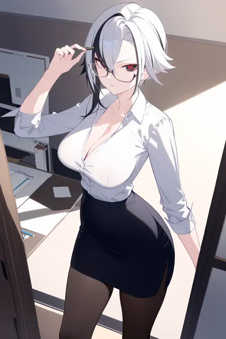 그녀의 기본 복장에 추가할 프롬프트(필요에 따라 추가/제거): 검은 장갑, 회색 테일코트, 검은 바지, 회색 베스트, 회색 셔츠, 하이힐