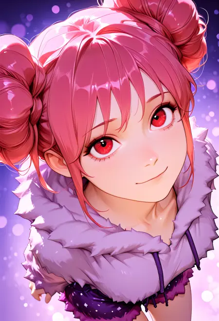 A character LoRA trained on Luna Rose (My made up character) - a girl with distinctive purple double buns, purple hair with sidelocks, and purple eyes. She wears a fluffy purple hoodie with fur trim and matching fluffy purple shorts.