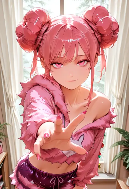 lunarose, double bun, fluffy hoodie, fluffy shorts,