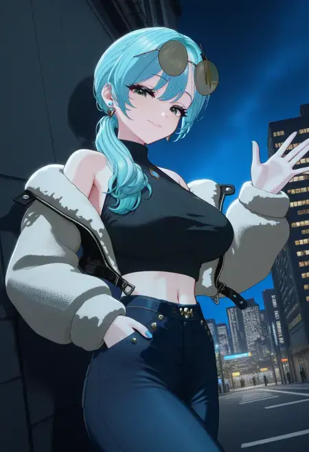 MareFlos, 1girl, ponytail, hair over shoulder, aqua hair, green eyes, large breasts, hair ornament, earrings,