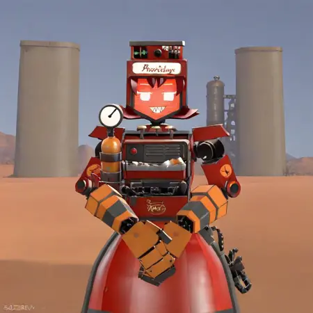 best quality, amazing quality, newest, absurdres, masterpiece, perfect anatomy, high resolution, detailed shading,dynamic lighting, 4k, 3d, detailed, 1girl, solo, DispenserLady, robot girl, sharp teeth, Screen face, boxy helmet, robotic limbs, red armor plating, black mechanical legs with orange knee pads, armored dress, red skirt, mechanical torso, red-orange colored parts, built-in tools, gauge on shoulder