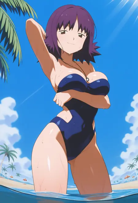 ネックレス、青いワンピース水着、胸元、ストラップレス、肩出し、サイドカットアウト