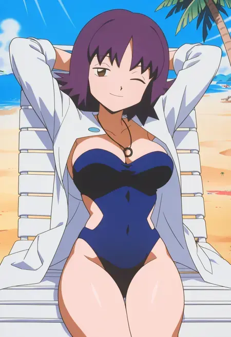 ネックレス、実験室コート、青いワンピース水着、胸元、ストラップレス、サイドカットアウト