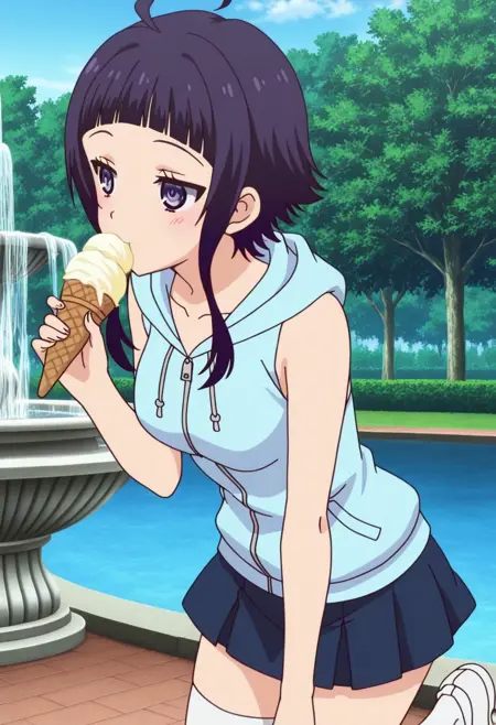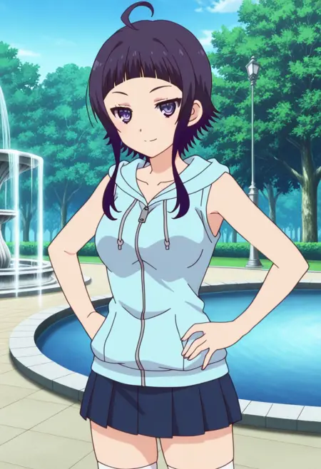 KanataCasual, 1girl, solo, 紫髪, まっすぐな前髪, 長めのサイドロックス付きショートヘア, サイドロックス, アホ毛, 紫の目, 中くらいの胸, クラビ骨, シャツなしフーディ, フードを下ろした状態, 青いミニスカート, 白いタイツ, 白い靴,