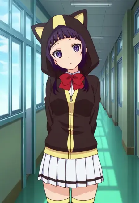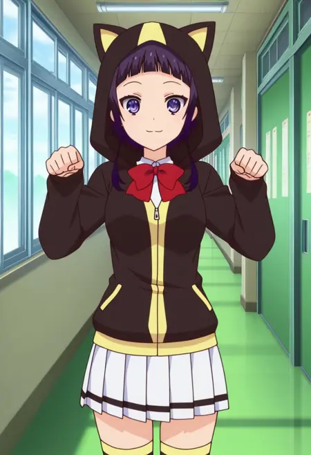 KanataUniform, 1girl, solo, 紫髪, まっすぐな前髪, 長めのサイドロックス付きショートヘア, 紫の目, 赤いボウタイ, 中くらいの胸, フーディ, 猫耳フード, 学校制服, 絶対領域, 白いプリーツスカート, 縞模様のタイツ, ローファー,