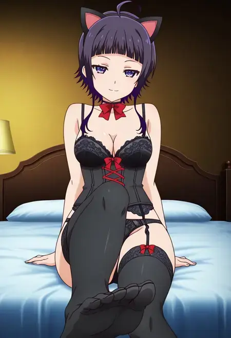 KanataLingerie, 1girl, solo, 紫髪, アホ毛, まっすぐな前髪, 長めのサイドロックス付きショートヘア, サイドロックス, 紫の目, 中くらいの胸, 偽の猫耳, 胸元, ランジェリー, 黒いコルセット, 黒いレースブラ, 黒いレースミニパンツ, 黒いガーターベルト, 黒いガーター, 黒いタイツ, 赤いリボン, 首の鈴, チョーカー, 足, 靴なし, 透けている服, 透けるタイツ,