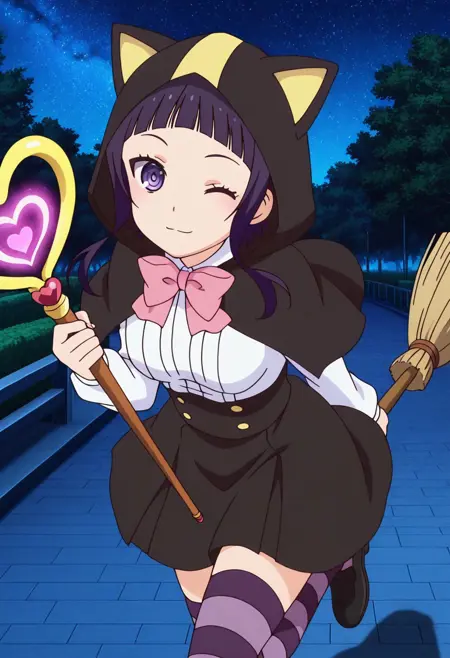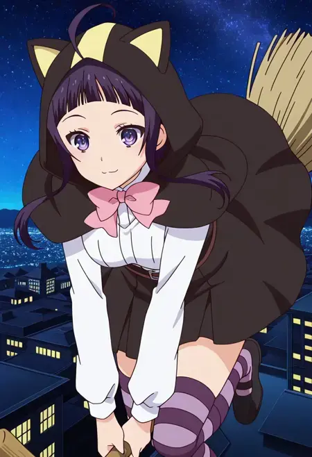 KanataWitch, 1girl, solo, 紫髪, まっすぐな前髪, 長めのサイドロックス付きショートヘア, アホ毛, サイドロックス, 紫の目, 中くらいの胸, 白いシャツ, 紫の縞模様タイツ, ほうきに乗っている, ほうき, 黒いスカート, 黒い靴, 猫耳フード, 長袖, 黒いキャップレット, ピンクのボウタイ,