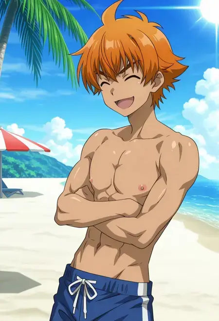 MicroGirlMakotoMale, 1boy, solo, orange hair, short hair, ahoge, orange-brown eyes, male focus, nipples, ((toned body:1.5)), abs, tanned skin, male swimwear, swim trunks, topless, NEGATIVE_HANDS, shiny skin,