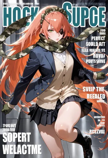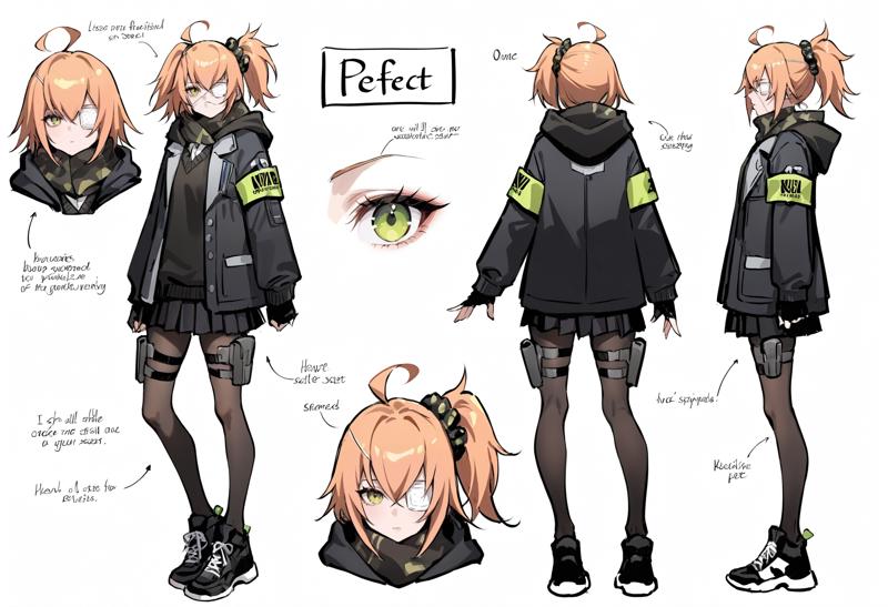Alternative Appearance Outfit: 1girl,eyepatch,medical eyepatch,yellow eyes,green eyes,hair between eyes,brown hair,orange hair,ponytail,long hair,short hair,bangs,ahoge,one side up,sidelocks,pantyhose,skirt,gloves,fingerless gloves,shoes,armband,hood,thigh holster,holster,jacket,pleated skirt,sneakers,black gloves,black skirt,black pantyhose,open clothes,hooded jacket,hair ornament,open jacket,hoodie,hood down,scrunchie,miniskirt,long sleeves,sweater,thigh strap,black footwear,black jacket,hair scrunchie,black sweater,shirt,school uniform