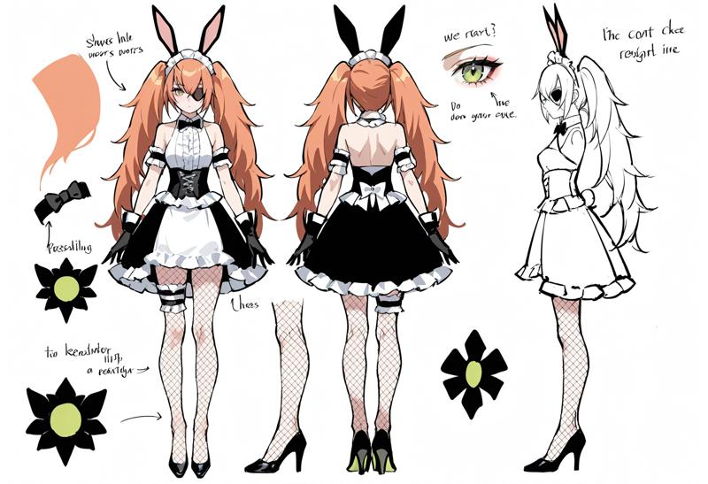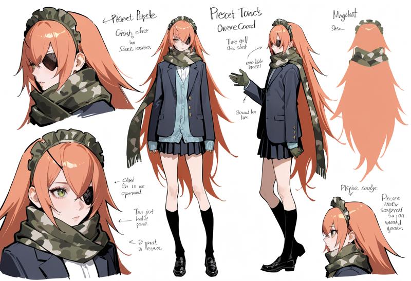 Outfit: v-shaped eyebrows,camouflage,eyepatch,green gloves,green scarf,scarf,armor,boots,armored boots,maid headdress,gloves,dress,gauntlets,maid,puffy sleeves,frills,long sleeves,chain,black dress,skirt,juliet sleeves,frilled dress,knee pads,corset,pants