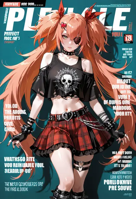 Fasion Outfit: twintails,two side up,hair ornament,skirt,spiked bracelet,gloves,fingerless gloves,spiked collar,plaid skirt,belt,shirt,plaid,collar,red skirt,bracelet,jewelry,black gloves,black shirt,boots,ribbon,midriff,off shoulder,hair ribbon,pleated skirt,choker,torn clothes,crop top,tank top,bare shoulders,studded bracelet,off-shoulder shirt,black footwear,alternate costume,heart hair ornament,studded collar,ring,black collar,socks,cross,black choker,knee boots,buckle,frills,gothic,red ribbon,black belt,studded belt,frilled skirt,thigh strap