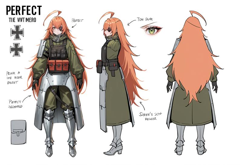 Alternative Outfit 2: ahoge,huge ahoge,cross,gloves,uniform,military,iron cross,boots,military uniform,black gloves,pouch,armor,long sleeves,jacket,ammunition pouch,green jacket,pants,apron,armored boots