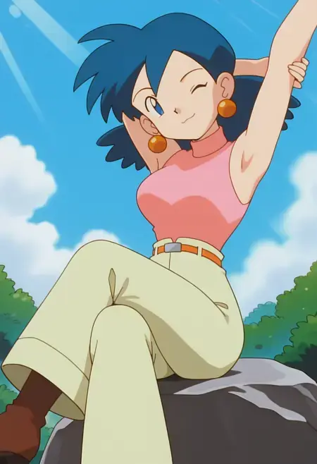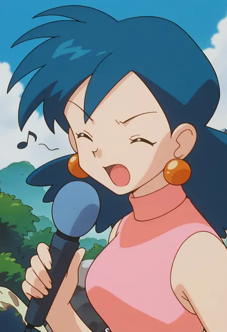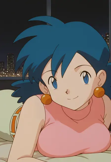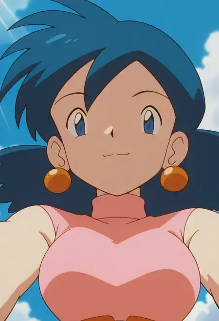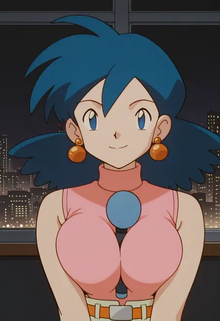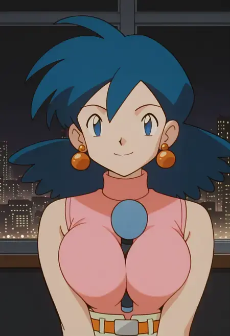 PMRep089, 1girl, earrings, blue hair, flipped hair, blue eyes, breasts,