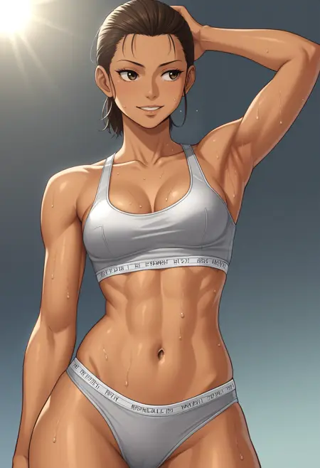 BGImJinHee, 1girl, brown hair, short ponytail, brown eyes, dark skin, small breasts,
