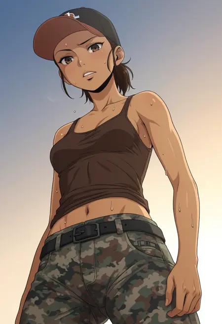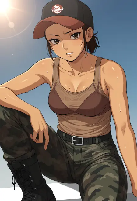 brown tank top, cleavage, sleeveless, camouflage pants,