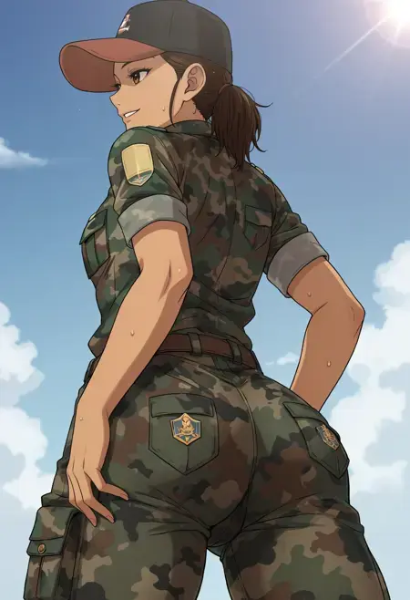 If the cross symbol keep remains on unintended position of her clothes, add "camouflage, badge, cross" tag to the Negative Prompts.