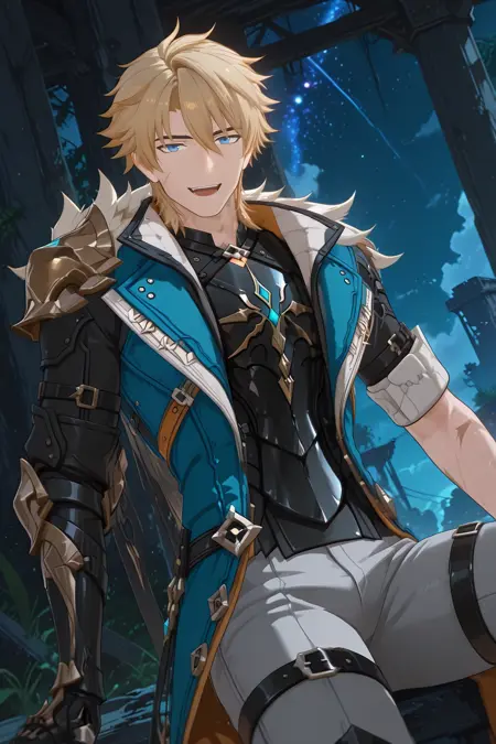 フリンジ付きコート、オープンコート、黒の胸板、片手だけのフィンガーレスグローブ、片手のガントレット、非対称の袖、グレーのパンツ、太ももベルト、黒いブーツ、