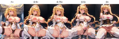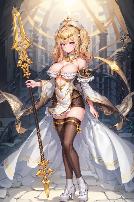 twintails, two side up, long hair, blonde hair, hair ribbon, circlet, purple eyes, cleavage, large breasts, clothing cutout, underboob, underboob cutout, bare shoulders, detached collar, detached sleeves, wide sleeves, bow panties, brown thighhighs, white high heels,