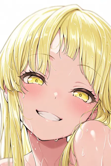 tsurumakikokoro, 1girl, solo, long hair, blonde hair, yellow eyes, shirt, smile, striped shirt, striped, button badge, badge, looking at viewer, jewelry, bangs, overalls, short sleeves, red shirt, overall shorts, smiley face, breasts, medium breasts, necklace, cslsk