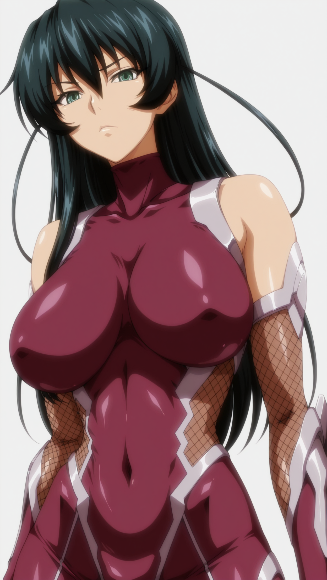 ((anime coloring)), masterpiece, best quality, amazing quality, Asagi, 1girl, long hair, black hair, green eyes, medium breasts, bare shoulders, taimanin suit, purple bodysuit, elbow gloves, solo, pose, standing, looking at viewer, from front, ((((white background, simple background))))
