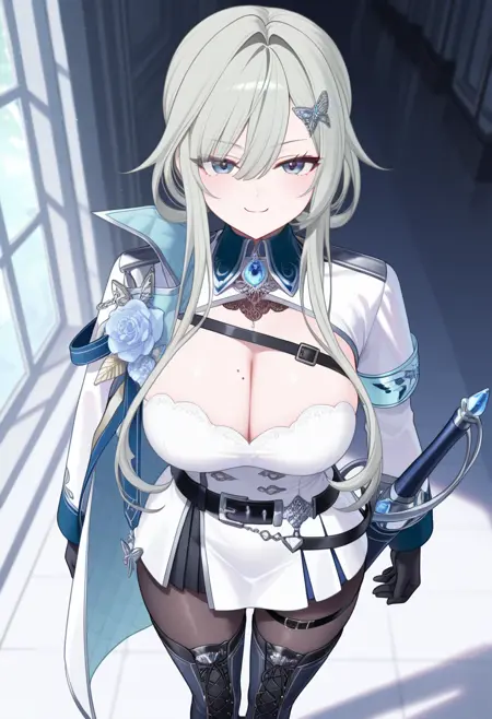white dress, black belt, armband, aiguillette, blue brooch, chest harness, blue rose,