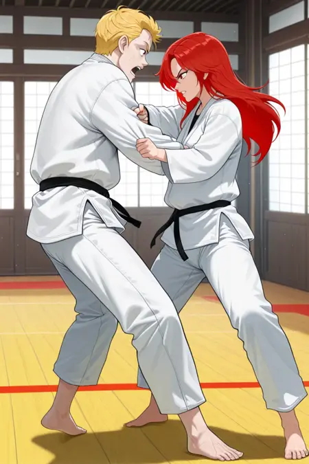 1girl, 1boy, dougi, sparring,