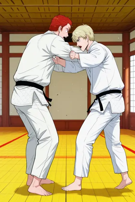 dougi, barefoot, 2boys, maledom, shirt grab, judo,