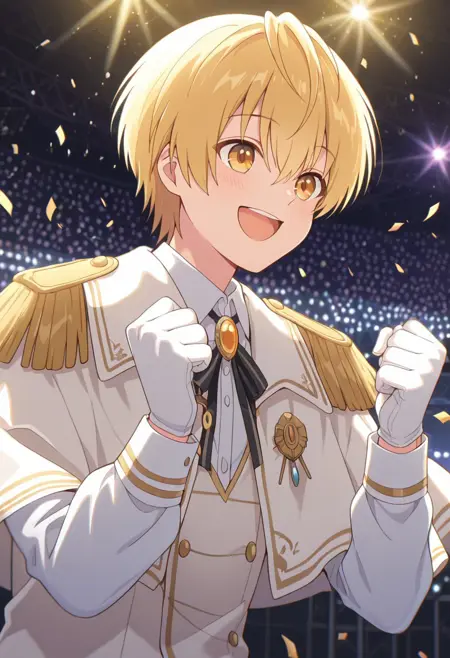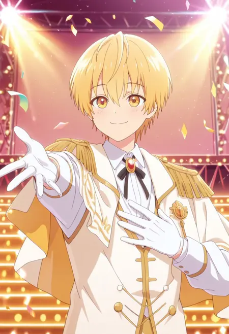 1boy, male focus, solo, yellow eyes, blonde hair, white shirt, collared shirt, brooch, neck ribbon, white capelet, epaulettes, white vest, long sleeves, white gloves, belt, white pants, white shoes,
