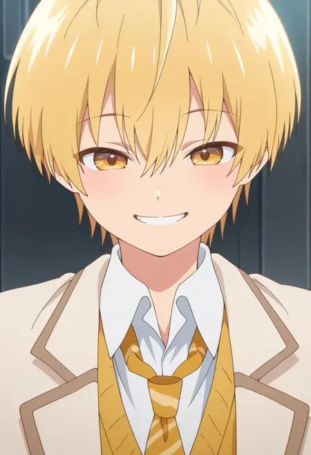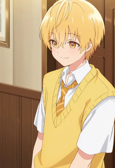 1boy, male focus, solo, yellow eyes, blonde hair, school uniform, white shirt, collared shirt, yellow necktie, striped necktie, sweater vest, yellow vest, short sleeves, black pants, plaid pants,