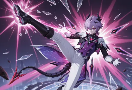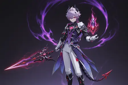 Gdurin, solo, 1boy, soft purple hair, small horns, purple eyes, black and white armored outfit, purple vest, high collar, shoulder guards, long purple coat tails, red accents, silver trim, white pants, white gauntlets, black knee-high boots , long segmented tail