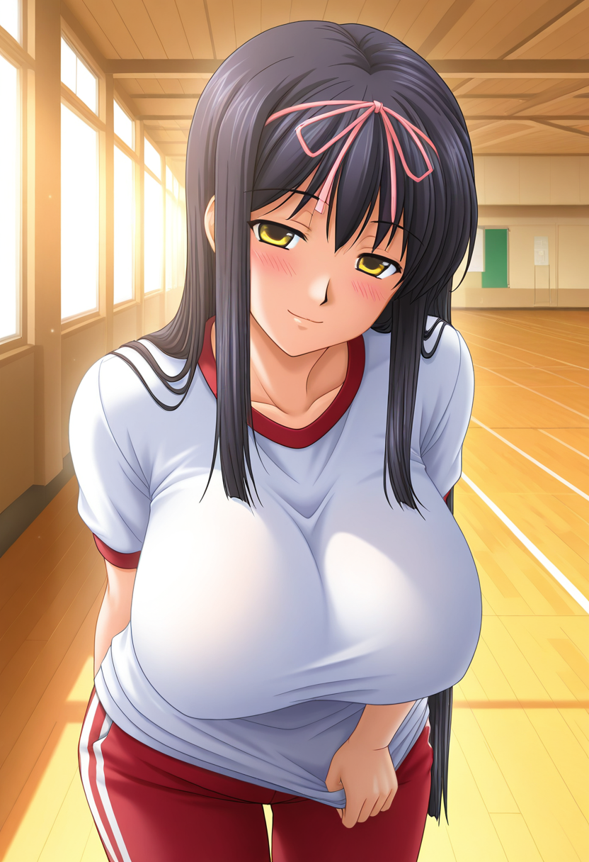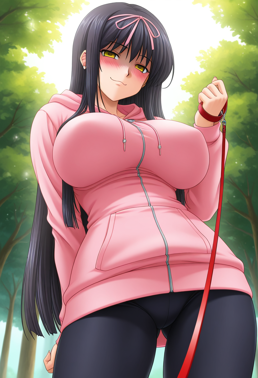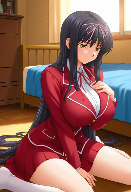 - riroww, yellow eyes, black hair, long hair, very long hair, pink hair ribbon,