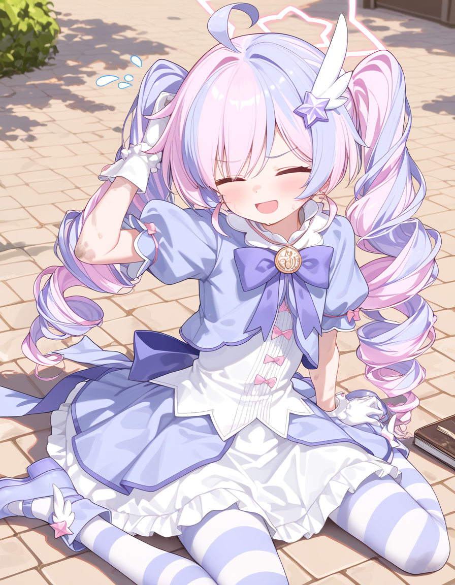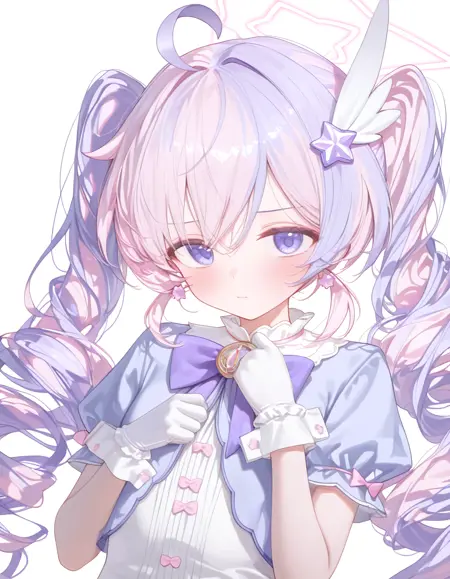 1个女孩,单人,蓝色档案,长发,粉发,紫发,浅蓝发,多色发,双色发,挑染发,双马尾,钻头发,蓝眼,紫眼,呆毛,光环,翅膀形发饰,星星发饰,连衣裙,蝴蝶结,星星\(符号\),蓬松短袖,夹克,紫色蝴蝶结,白手套,条纹连裤袜,