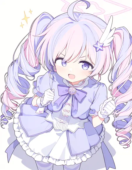 1소녀, 혼자, 블루 아카이브, 긴 머리, 분홍 머리, 보라 머리, 연한 파란 머리, 다색 머리, 이색 머리, 줄무늬 머리, 쌍꼬리, 드릴 머리, 파란 눈, 보라 눈, 아호게, 환상, 날개 모양 머리 장식, 별 모양 머리 장식, 드레스, 리본, 별 \(기호\), 부푼 짧은 소매, 재킷, 보라 리본, 흰 장갑, 줄무늬 팬티스타킹,