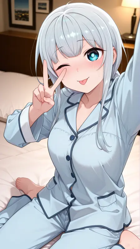 mmmadoka, bangs, grey hair, braided ponytail, light blue eyes, medium breasts,