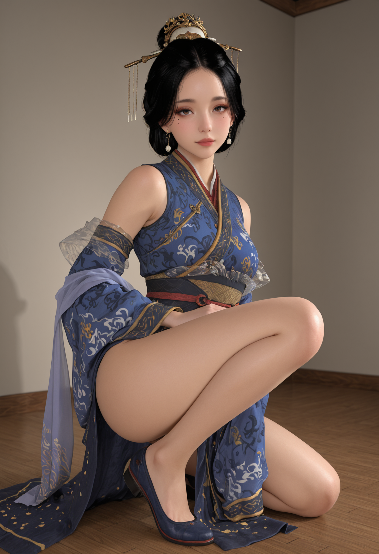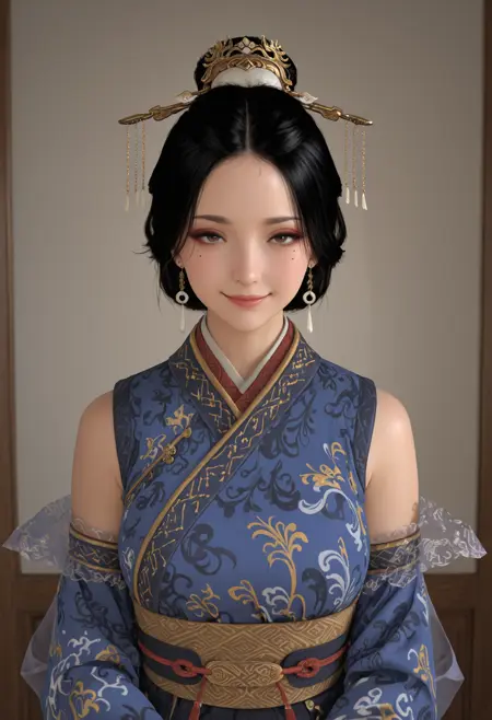 lady_zhen, 1girl, solo, black hair, hair ornament, dress, hair stick, jewelry, earrings, detached sleeves, hair bun