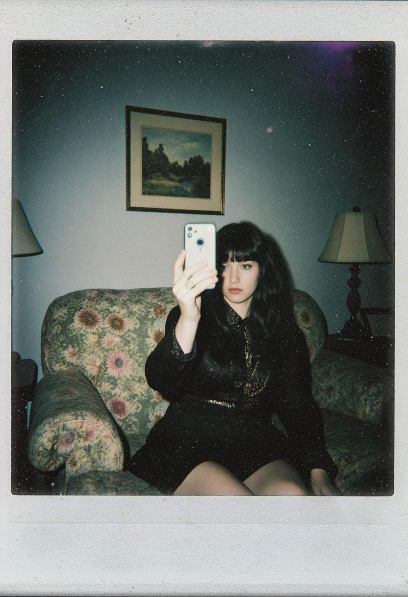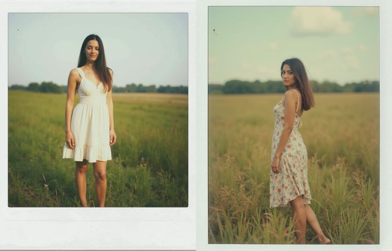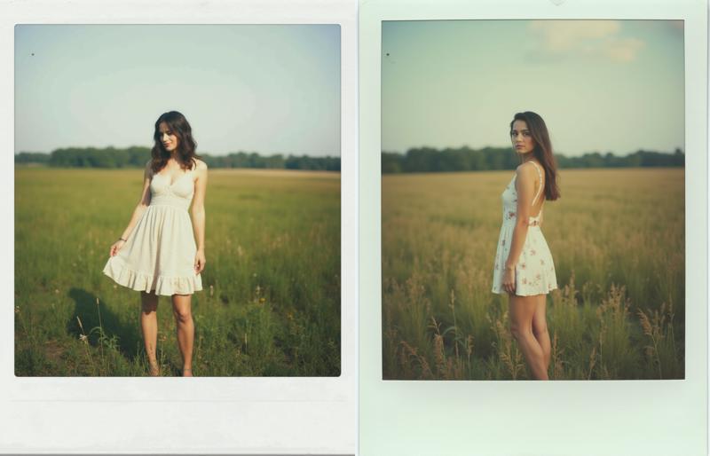 a close-up polaroid photo of a woman standing in a field wearing a sundress