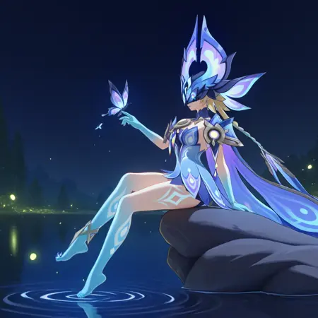 WayHrSprt, 彩色皮肤, 蓝色皮肤, 金色头发, 低马尾, 编织马尾, 彩色四肢, 浅蓝色脚部, 头饰, 脚链, 浅蓝色双手, 蓝色嘴唇, 口红, 覆盖双眼, 蓝色面罩, 多色面罩, 多色头饰, 手镯, 腿部纹身, 蓝色头饰, 帽子, 高领, 分离式衣领, 吉祥物, 流苏, 项链, 无肩带连衣裙, 蓝色连衣裙, 浅蓝色连衣裙, 腰部斗篷, 紫色镶边, 分离式斗篷, 多色连衣裙, 多色斗篷, 蓝色斗篷,