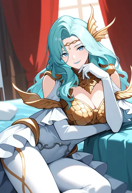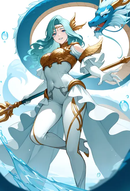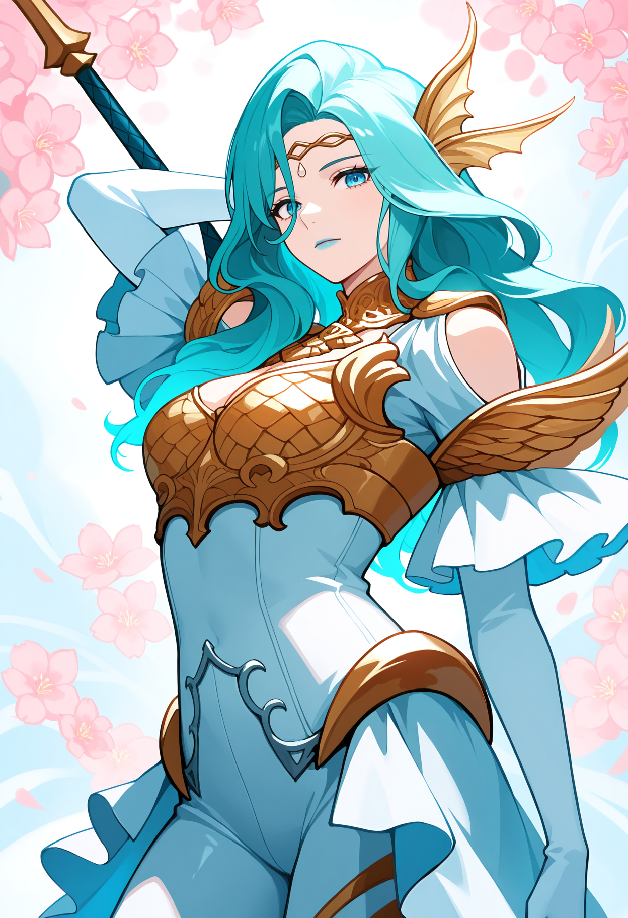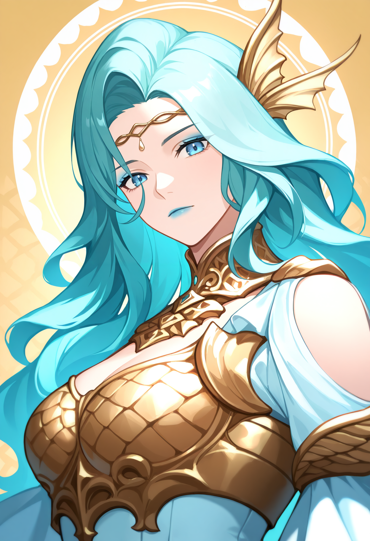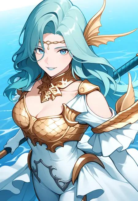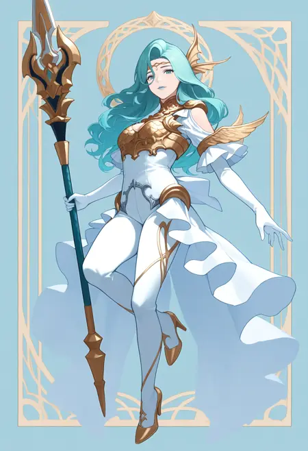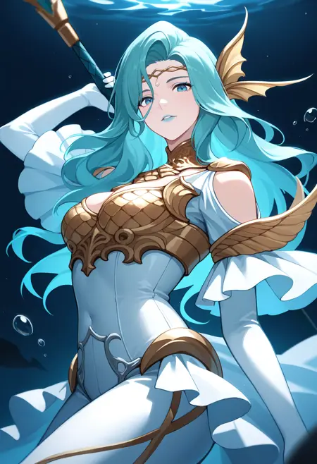 | 训练词汇 | lymlnff, blue eyes, blue eyeshadow, aqua hair, long hair, wavy hair, circlet, blue lips, lipstick, makeup, hair ornament, head fins, gorget, armored dress, tight clothes, skin tight, frilled dress, white dress, gold armor, shoulder armor, breastplate, shoulder cutout, cleavage cutout, bare shoulders, frilled sleeves, gold armlet, elbow gloves, white gloves, white bodysuit, bodysuit under clothes, faulds, frilled skirt,已复制! |