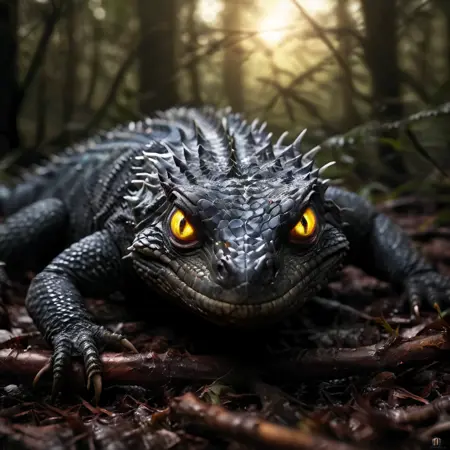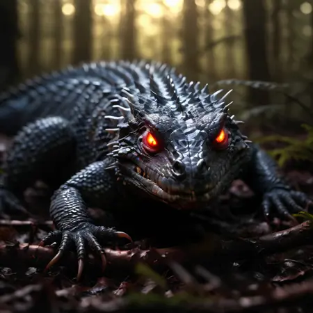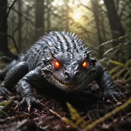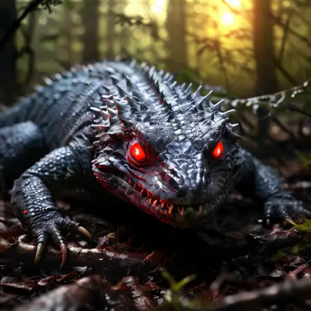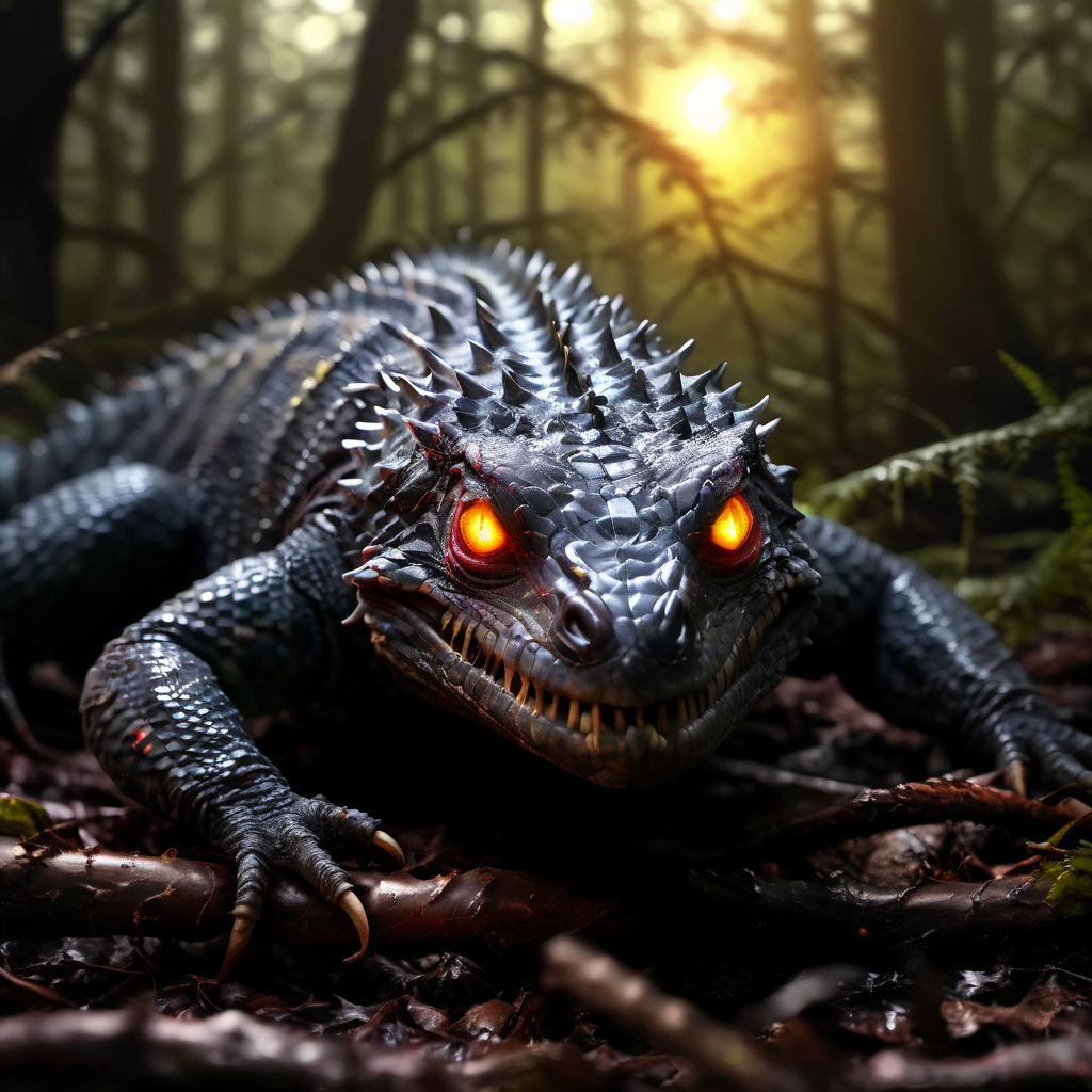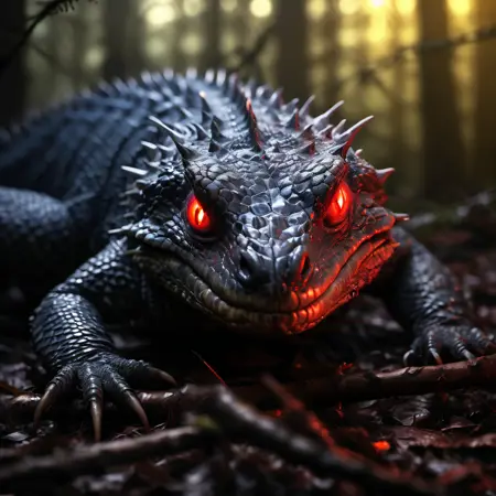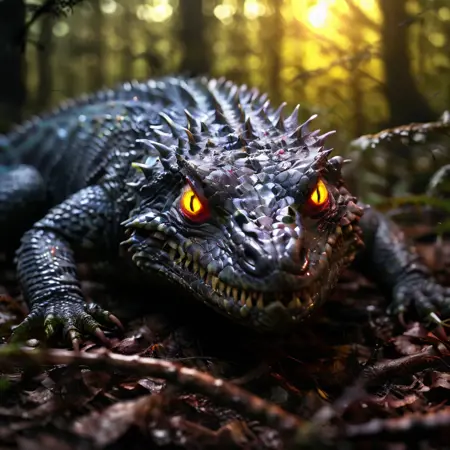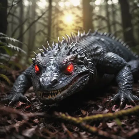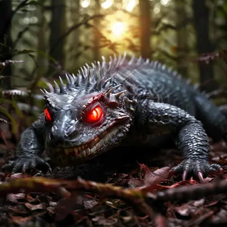 basilisk, blurry, blurry background, claws, depth of field, fangs, glowing, glowing eye, glowing eyes, horns, looking at viewer, no humans, open mouth, realistic, red eyes, scales, sharp teeth, slit pupils, solo, spikes, teeth, yellow eyes,
