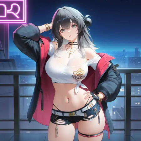 ParvatiAG, Prv_Def, 灰色眼睛, 灰色头发, 渐变发色, 透视胸线, 露脐上衣, 白色衬衫, 露肩衬衫, 打结衬衫, 印花衬衫, 多条项链, 腰带项圈, 黑色项圈, 发夹, 露肩, 开襟外套, 露腹, 脐环, 单只露指手套, 黑色手套, 脐部, 黑色夹克, 双面夹克, 蓬松长袖, 不对称袖子, 黑色袖子, 金色手镯, 微型短裤, 黑色短裤, 牛仔短裤, 破洞短裤, 白色腰带, 金属扣, 内裤带, 大腿绑带, 黑色鞋履, 踝靴, 红色袜子, 腰带靴,